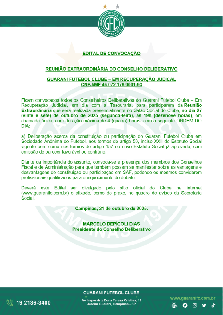 O edital pode ser conferido ao final desta matéria, mas os Conselheiros Deliberativos não determinarão a constituição ou participação do Clube em SAF, apenas emitirão parecer, seja favorável ou contrário, que será encaminhado para uma Assembléia Geral de Associados, esta sim, capaz de transformar, por decisão de sua maioria, o sistema de gestão do futebol do Guarani.